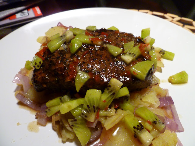 When the sauce is reduced and the pork is complete, remove from heat. [Put the pork on the bed of mixed potato and slaw.] Add the lemon juice, and kiwi to the reduced sauce. Sort of cook the finely chopped kiwi for a 1 minute in the sauce and then pour it all on top of the pork and slaw.